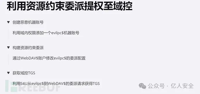 添加机器账户,修改msDS-AllowedToActOnBehalfOfOtherIdentity值为机器账户的SID ,然后以机器 账户的身份伪造成administrator申请⼀张访问此机器账户机器的 ticket (类似于白银票据),因为机器账户没 有配置约束性委派,所以这张票据是不可转发的,但是在基于资源的约束性委派中,票据是否可以转发不重要,对之后对 s4u2proxy不影响,最后利用这张ticket去申请访问修改了msDSAllowedToActOnBehalfOfOtherIdentity属性的机器。