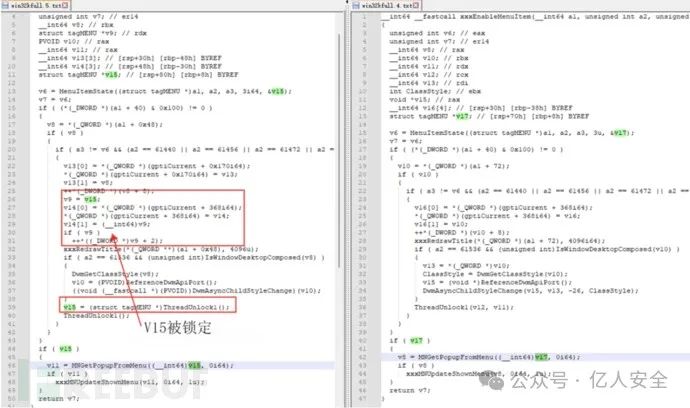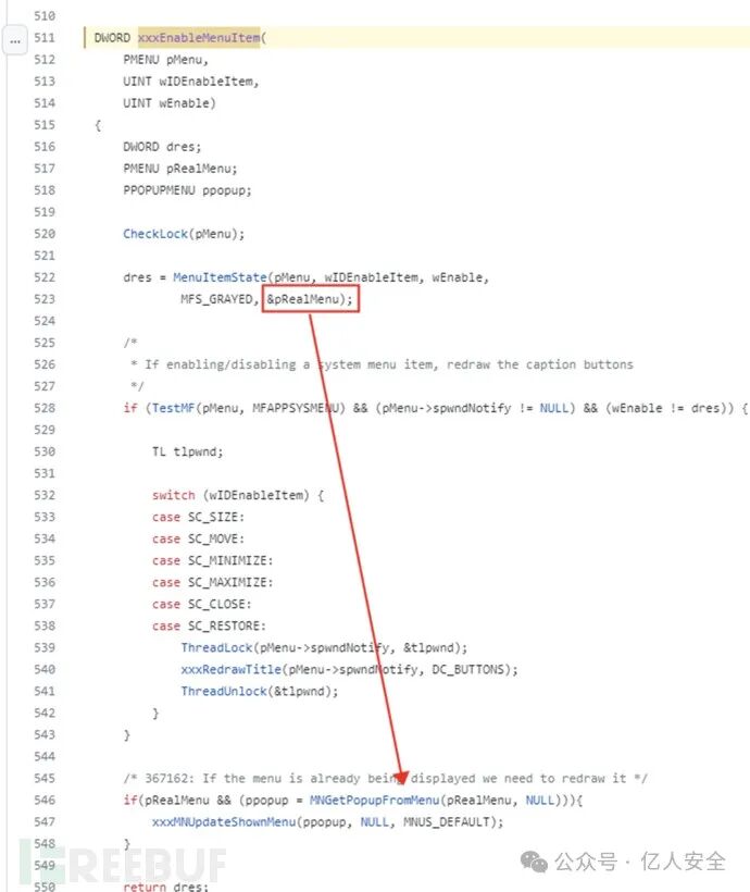 笔者的研究是在Windows Server 2016 上进行的,通过网上的漏洞分析博客和研究该漏洞补丁,笔者发现了一个相当有趣的问题。漏洞的代码看起来是特定对象的引用计数经历了多次增量(图六),由于win32k代码的古老性,笔者只能通过列举一些早期的源代码注释(图七)增加说服力。Win32k的代码实现仅专注于锁定窗口对象,无意中忽略了锁定嵌套在窗口对象中的菜单对象。那么该窗口中菜单对象的错误引用是如何发生的呢?笔者对漏洞函数上下文进行了分析(图八、图九)。在分析过程中,笔者发现了一个值得注意的问题。虽然传递给 xxxEnableMenuItem() 的菜单通常被锁定在更高级别的函数中,但准确确定在这种特定情况下应保护哪个菜单对象提出了一个需要确定的问题。通过继续深入分析xxxEnableMenuItem函数,笔者仔细检查了菜单对象的潜在处理,发现了一个重要的问题,即MenuItemState函数返回的菜单不仅可以包含窗口内的主菜单,还可以扩展到子菜单,在某些情况下甚至可以扩展为子子菜单。