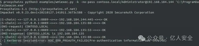 操作员可能会尝试使用 Rubeus 从主机生成新的信标,以将执行S4U时检索到的TGS票证导入到当前登录会话中。虽然此技术在针对其他主机时有效,但当尝试从同一主机使用WMI执行信标时,似乎不会执行“完整网络登录”。相反,会利用与流程关联的安全令牌。结果如下图所示。尽管“管理员”用户的TGS令牌与其登录会话相关,但辅助信标是作为JSMITH用户生成的。为了避免遇到此问题,我们必须使用SOCKS将Impacket代理到主机来执行完整的网络登录。