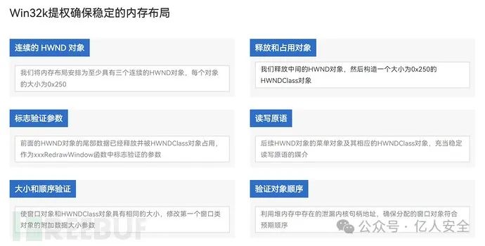 在利用Win32k提权漏洞时,必须进行初步的评估,以避免在无法绕过的情况,从而节约大量的时间。在分析其poc 或exp时,构建针对此特定漏洞的漏洞利用之前,需要考虑如下两种情况:执行Shellcode\ 使用读写原语修改令牌地址。基于早期的 CVE-2017-0263 和 CVE-2016-0167 漏洞涉及执行shellcode操作。笔记不建议使用这种方法,因为在较高版本的 Windows中执行shellcode行为和安全机制(如 SMEP)存在不小的挑战。在过去的几年当中,公开的poc已经证明了使用读写原语修改令牌地址的优越性。虽然这类漏洞利用在桌面堆内存布局和桌面堆中的读写原语方面显示出了持久性、通用性,但是也存在不小的挑战。在重用UAF(释放后使用)内存时,如何控制 cbwndextra 的值?答:笔者建议将整个利用分为两个不同的问题:1、使用UAF漏洞控制cbwndextra的值;2、在获得cbwndextra值的控制权后建立读写原语的稳定方法。