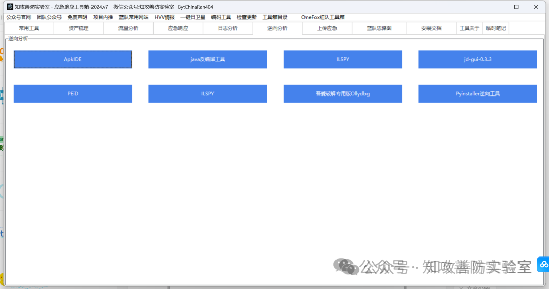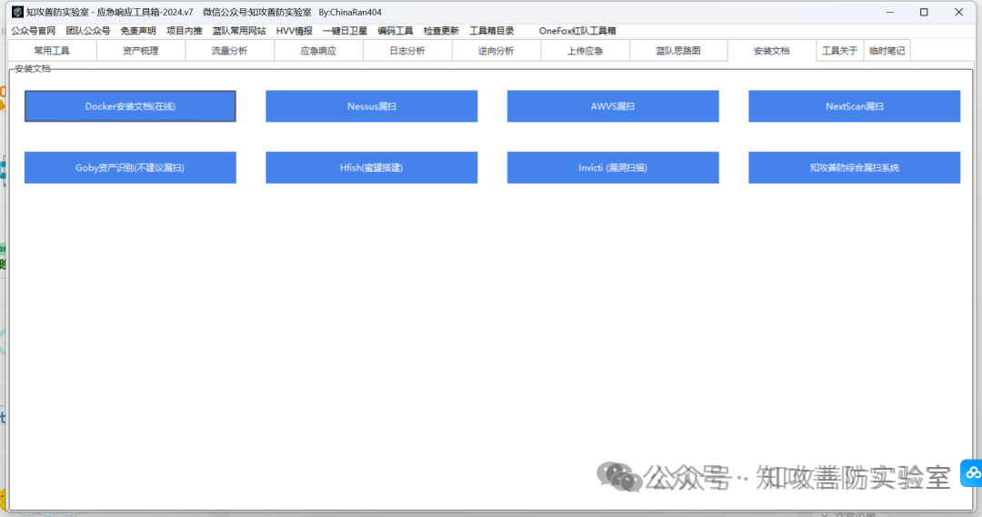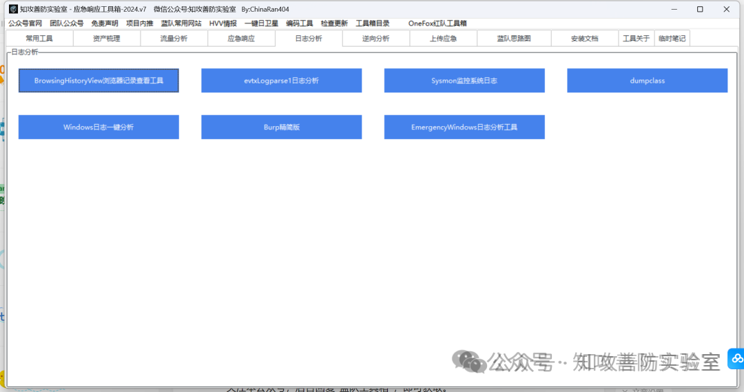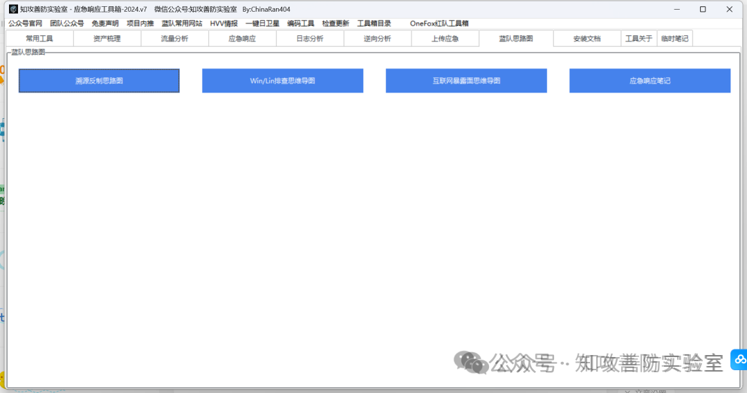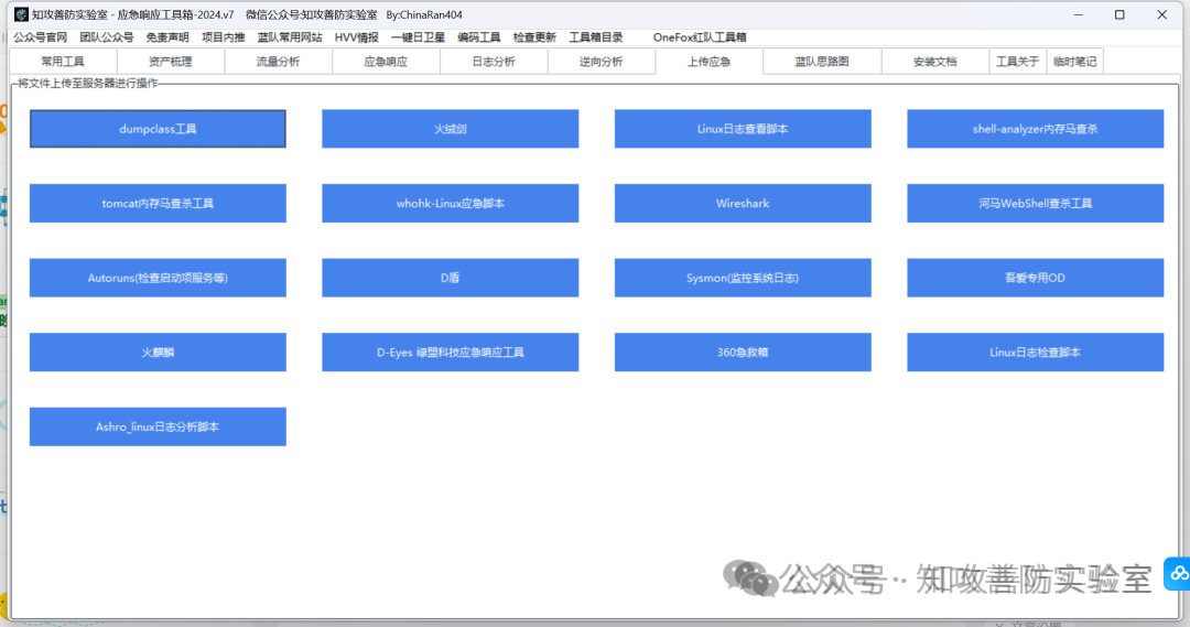 集成模块:“常用工具”,“流量分析”,“应急响应”,“日志分析”,“逆向分析”,,“上传应急”,“蓝队思路图”,”安装文档“,“临时笔记”等 9 个模块。