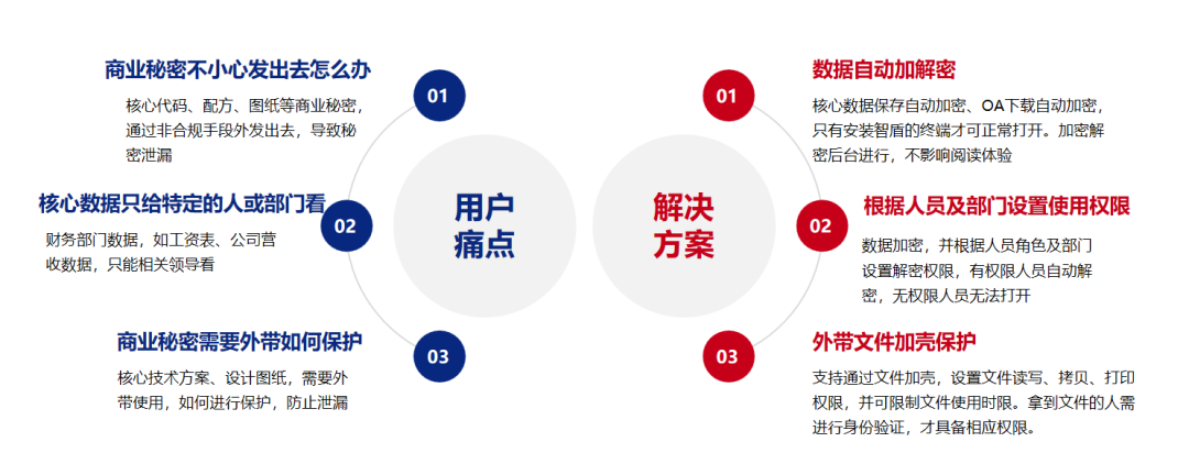 针对内部人员这种商业秘密窃取行为,**办公智盾采用文件加密机制,**通过下发加密策略,对重要文件进行加密,即使文件不幸被窃取,由于加密保护,第三方也无法查看文件内容,有效防止了商业秘密的泄露。此外,对于需要外带出去的商业秘密,办公智盾提供文件加壳功能,限制文件的使用人、使用时间、使用次数以及打印权限,保障外出文档的安全。