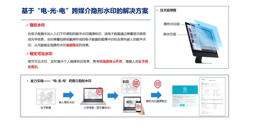 针对用户恶意拍照窃密**,办公智盾采用水印追踪技术,**在图片中嵌入隐形水印,这些水印包含了被拍照终端的信息及责任人信息。一旦发现商业秘密泄露,可通过提取水印信息,迅速定位到泄密源头,为后续的追责和处置提供有力证据。此外,结合水印时间戳与智盾的审计信息,还能获取更多详细的取证信息,为商业秘密保护提供全方位的支持。
