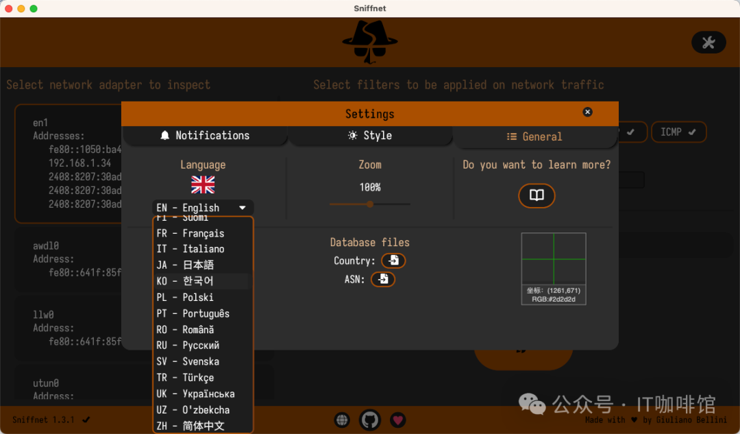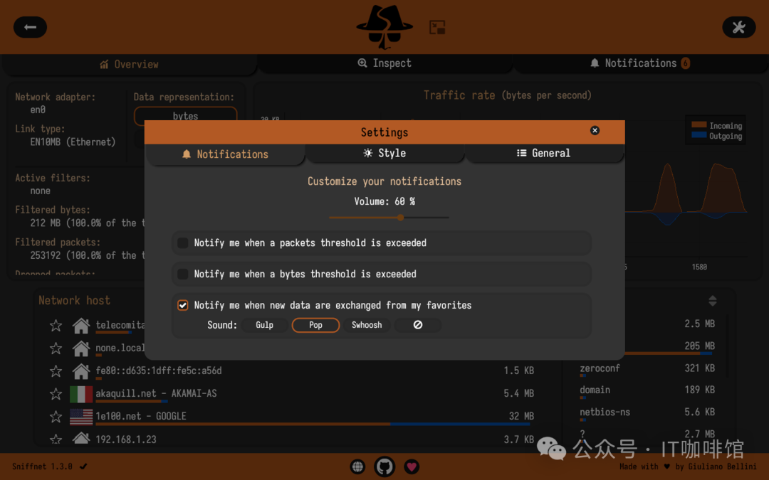 在设置里的通知(notification)选项卡里,我们可以对Sniffnet的通知事件进行配置,可以让Sniffnet针对特定的网络时间进行告警和通知。