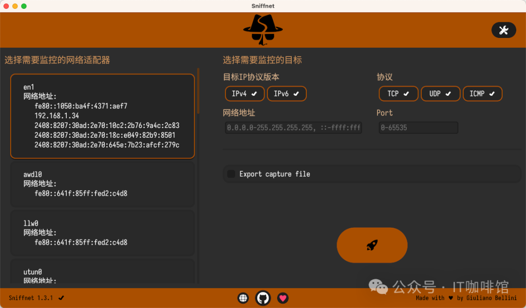 选择了网络适配器后,可以配置过滤器。Sniffnet提供了一些可选的过滤类型,如:IP版本、协议、网络地址和端口等。这是在应用程序初始页面的右上角完成的。如图: