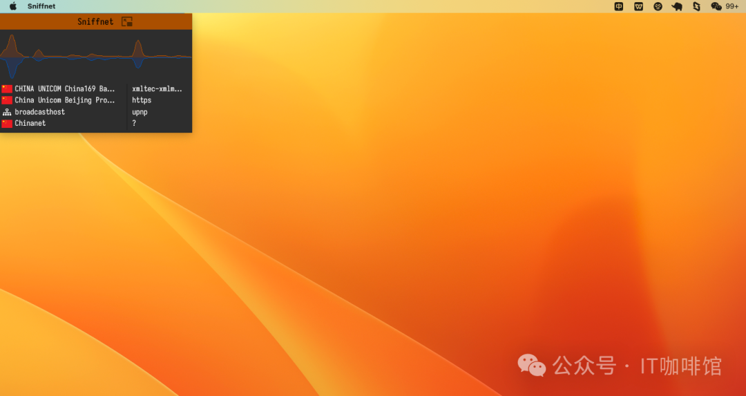 实时流量监控:Sniffnet 允许用户实时监控网络流量。它捕获经过网络接口的数据包,并将其显示在用户界面上。用户可以查看实时的流量图表、数据包统计和相关信息,以便及时发现任何异常或潜在的威胁。