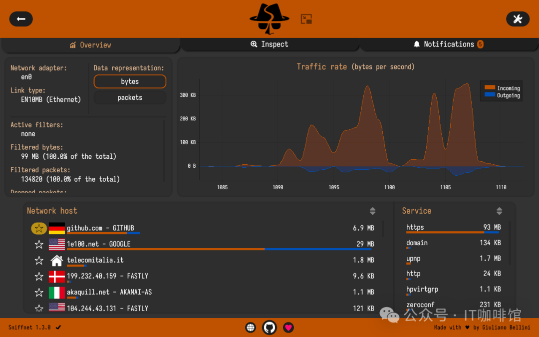 现在一切都准备好了,可以开始监控互联网流量了️,只要你的机器交换任何网络数据,就可以在Sniffnet的流量视图页面上看到几个实时统计数据。顾名思义,此页面以仪表盘的形式展现了你的互联网活动。如图: