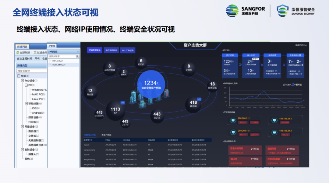 智能感知与预警:智能感知终端违规接入、敏感数据泄密、上网违规行为等内部风险,实现风险的智能识别和预警。