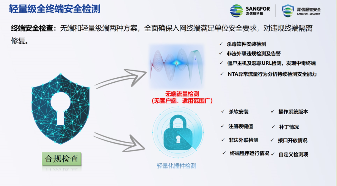 通过多种资产识别技术,保障终端类型识别精准快速,并结合终端合规性检测技术实现安全管控,如杀软推送、U盘管控、非法外联控制。