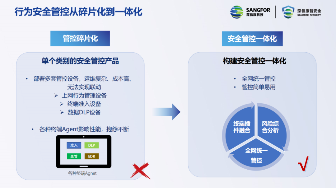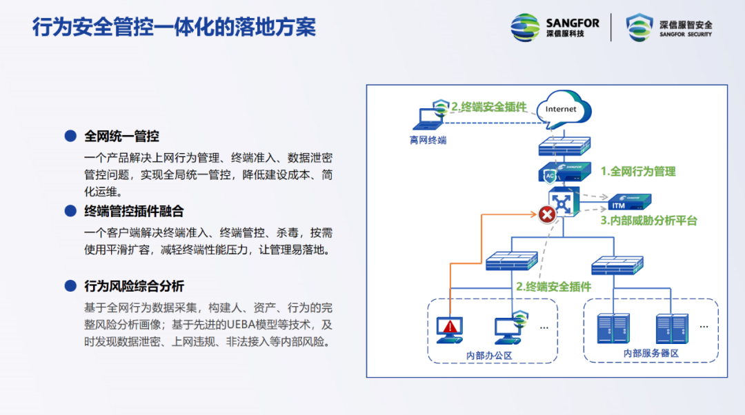 一体化管控:实现上网管控、终端准入管控和数据泄密管控的一体化管控,解决内部人员全阶段的行为安全风险问题。