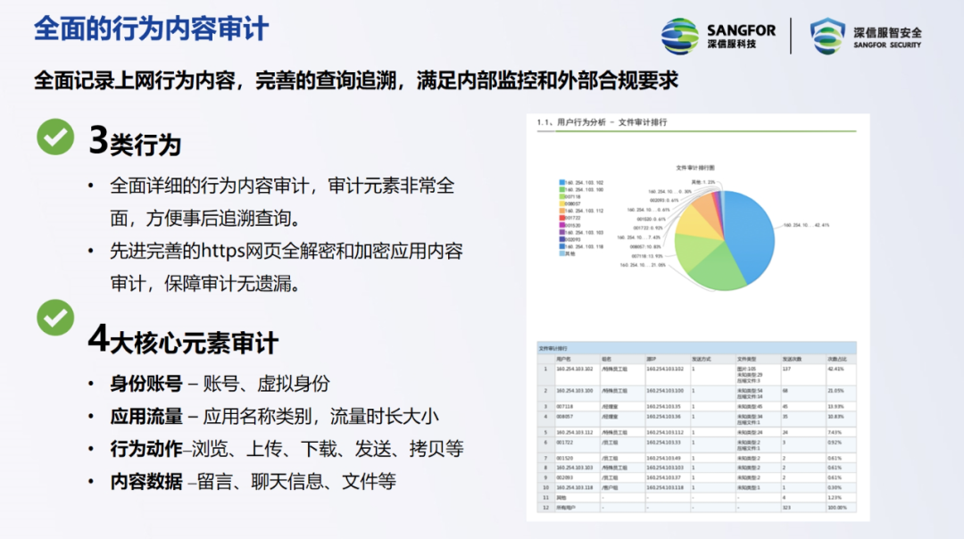 全面的网络审计、业务审计、终端审计,数据使用和外发行为清晰记录。