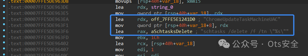 该恶意软件的主函数调用了一个名为main_anti的函数。首先,它使用schtasks删除了一个名为“ChromeUpdateTaskMachineUAC”的计划任务。