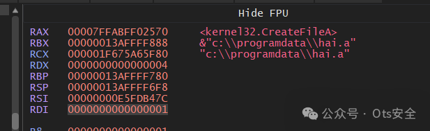 在 ProgramData 路径中,它会释放另一个文件,其名称与 DLL 导出函数相同。DLL 稍后会使用此文件检查执行方法。如果该文件存在,则表明 DLL 是由主安装程序执行的,而不是由沙箱或分析师执行的。