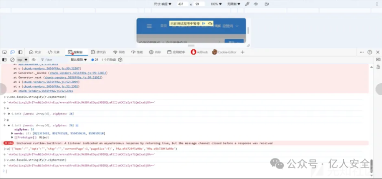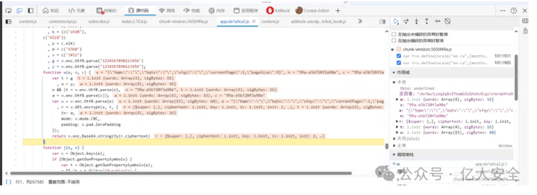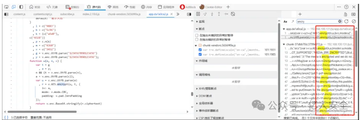 在上面添加的XHR断点调试后,经过了一段时间调试前端代码,但还是找不到加密代码出来,废了不少时间,后来直接搜索encrypt后直接就搜索出来了,但是有几段的加密代码,经过添加断点才确定了。