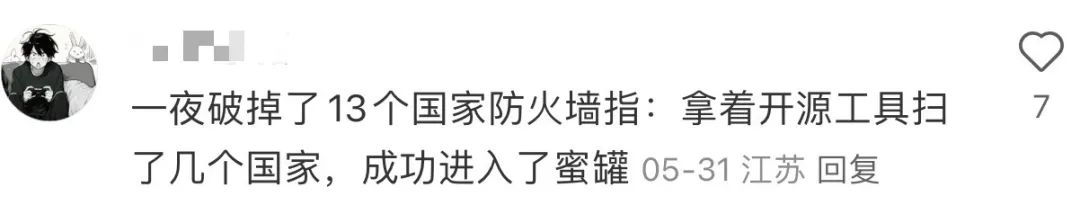 另一位同学给这位“顶级黑客”的行动加了注释:一夜破掉13个国家防火墙是指:拿着开源工具扫了几个国家,成功进入了蜜罐 ↓