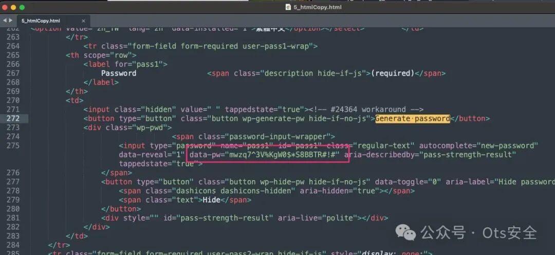 这个 HTML 文件中有相当多的源代码,但如果我们返回到我们的新用户表单屏幕截图,我们会看到在我们感兴趣的区域中有一个生成密码按钮。如果我们在源代码中搜索该按钮标签,它应该会让我们非常接近我们想要的战利品。