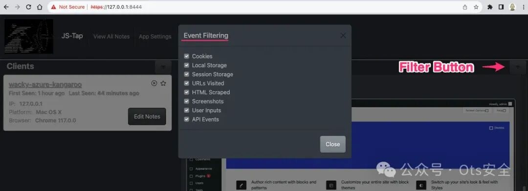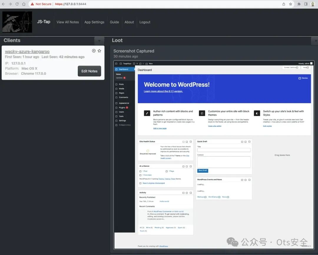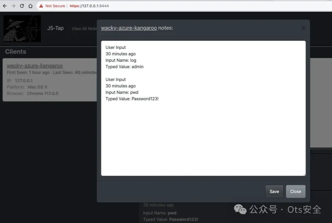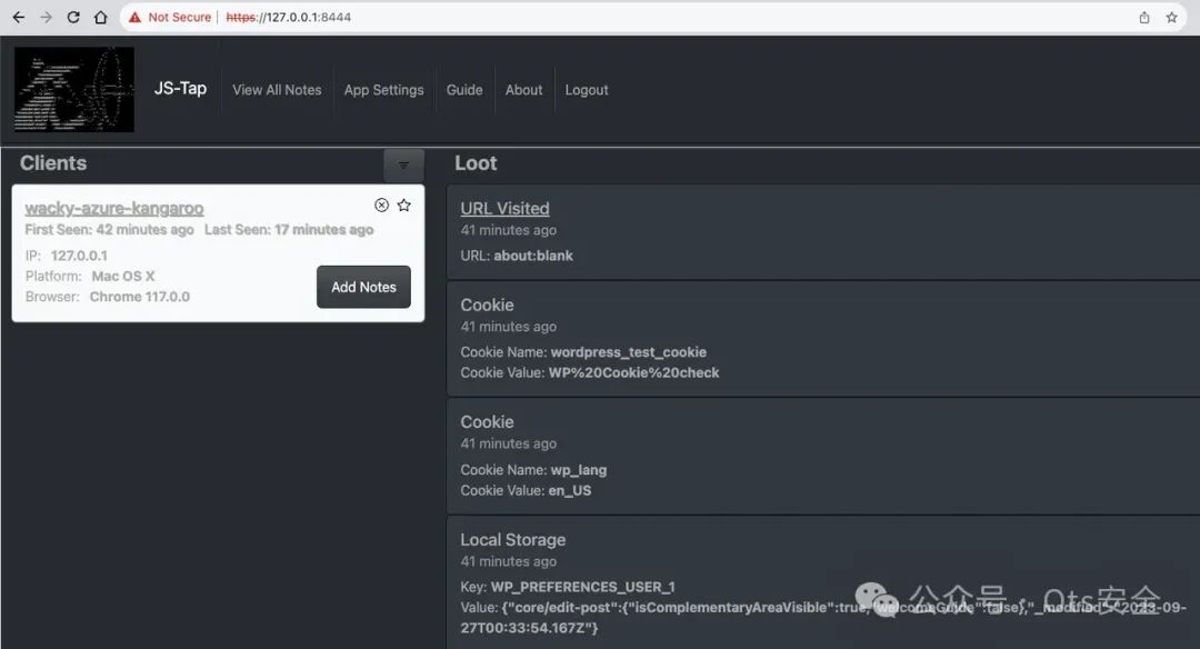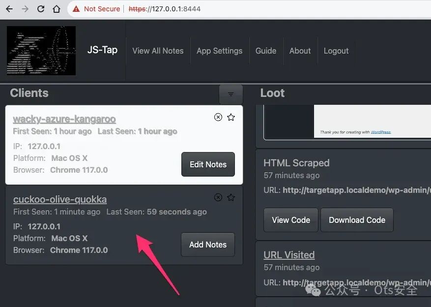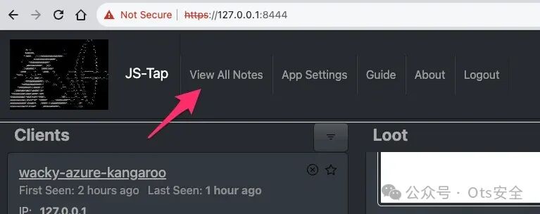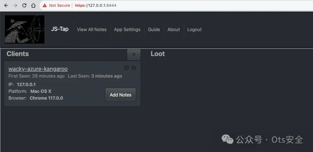 这足以让我们开始了解 JS-Tap 迄今为止从目标收集了哪些信息。在 JS-Tap 门户中,客户端将列在左侧,目前只有一个。