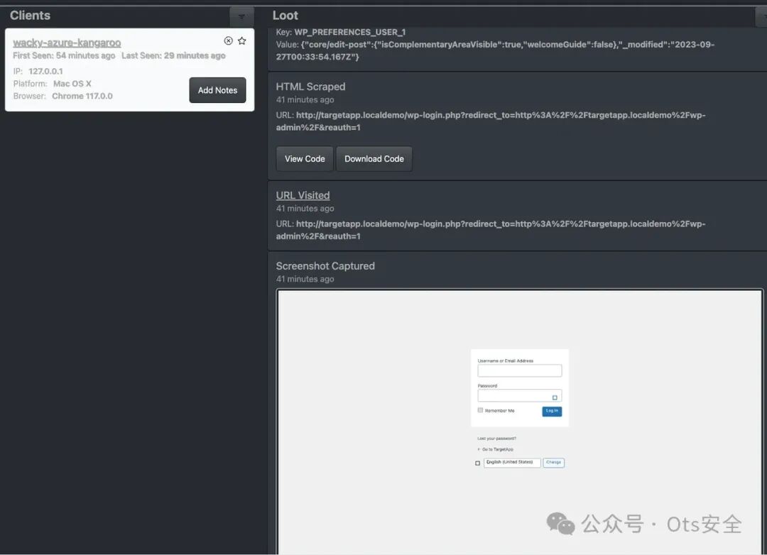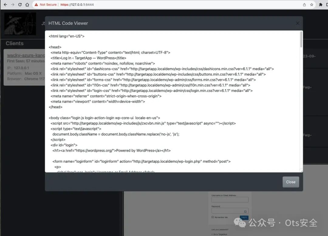 接下来,我们将启动 JS-Tap 服务器并接收登录门户的凭据。以下示例中的 JS-Tap 有效负载配置为陷阱模式,并将 WordPress 管理员登录门户设置为 iframe 陷阱起始页。