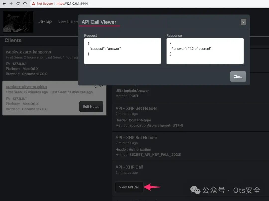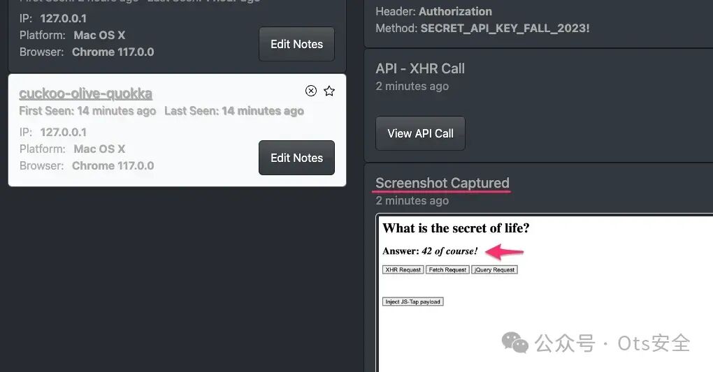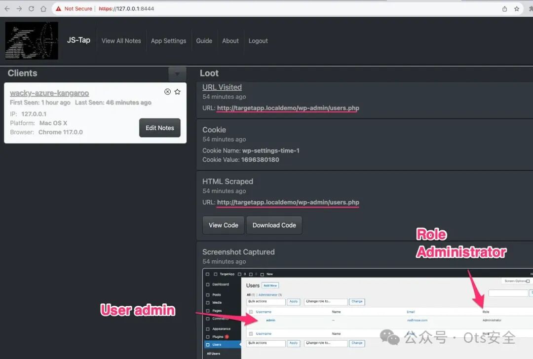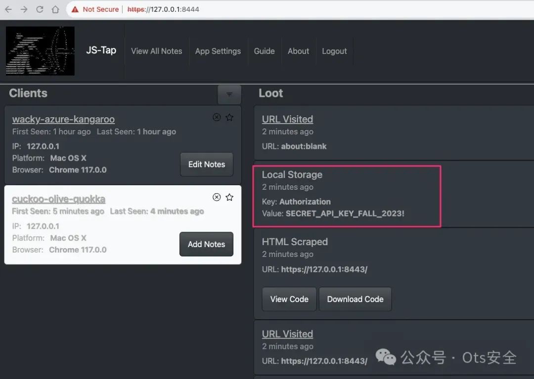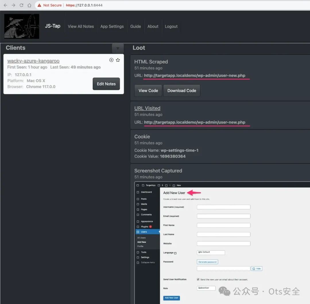收集到的数据会显示在 JS-Tap 门户网站上——这是一个基于网络的应用程序,可以监控运行有效负载的客户端。