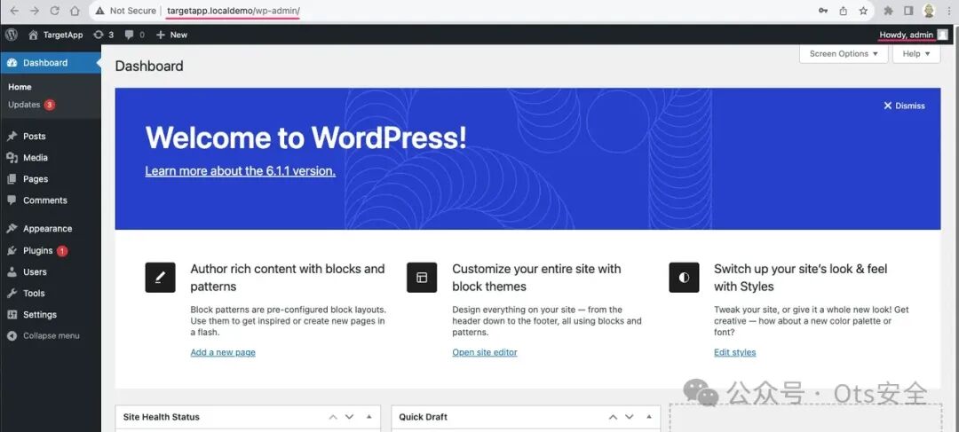 用户可以看到 WordPress 的管理仪表板。我们可以在右上角看到他们的用户名,以及与真实仪表板位置相匹配的欺骗地址栏位置。