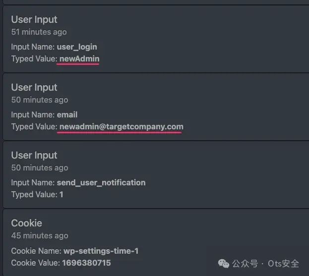 虽然无法捕获 WordPress 会话 cookie,但 JS-Tap 正在捕获用户输入,因此下一组事件包括我们在其中捕获其凭据的用户输入事件。