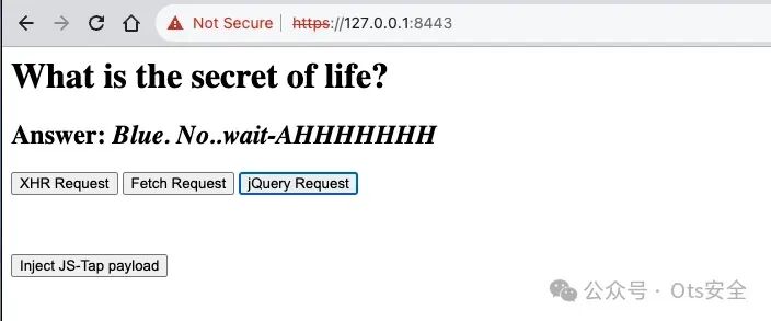 我们应该能够将 JS-Tap 有效负载注入到我们的 monkeypatch 应用程序中,并进行所有三个网络调用。