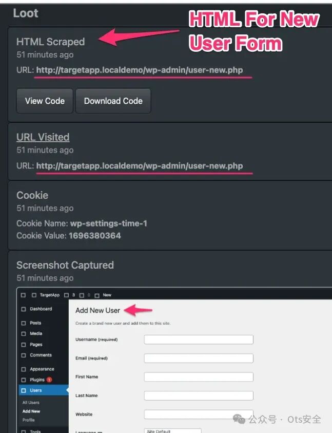 我们可以看到与捕获的用户输入相匹配的必填字段,但查看密码区域,我们发现有生成密码和隐藏密码的选项。如果 WordPress 向我们的目标显示生成的密码,则该密码一定位于网页本身中。我们可以在事件列表中向后滚动并下载与此页面匹配的抓取 HTML 代码并搜索此密码。