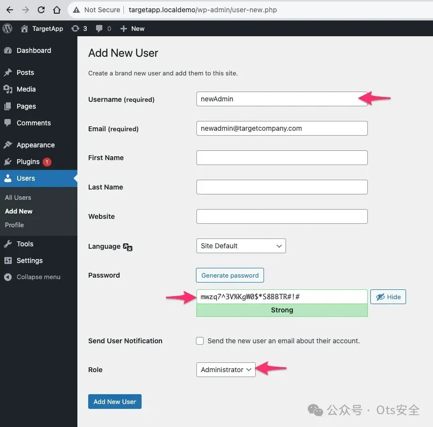 我们看不到这个新用户的密码。这是因为我们的目标没有为新用户输入密码,他们使用了 WordPress 自动生成的安全密码。让我们通过选择新用户表单屏幕截图并打开全尺寸视图来仔细查看它。