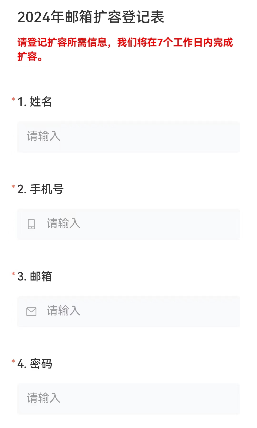 某国企员工收到一封来自**“××应急小组”的邮件,正文说可以申请邮箱扩容,正文中附【2024邮箱扩容登记表】问卷星二维码**,收件人扫码后需在问卷中填写姓名、手机号、邮箱、账号密码等敏感信息。