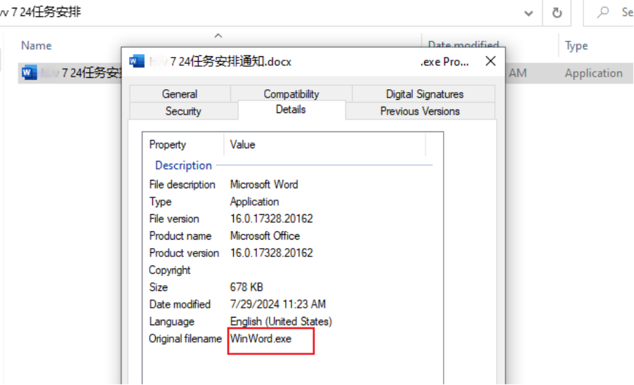 1、压缩包存在可执行恶意文件,通过使用图标伪装及双后缀两种技术,误导收件人相信这只是普通的Word文件,从而下载并打开文件。