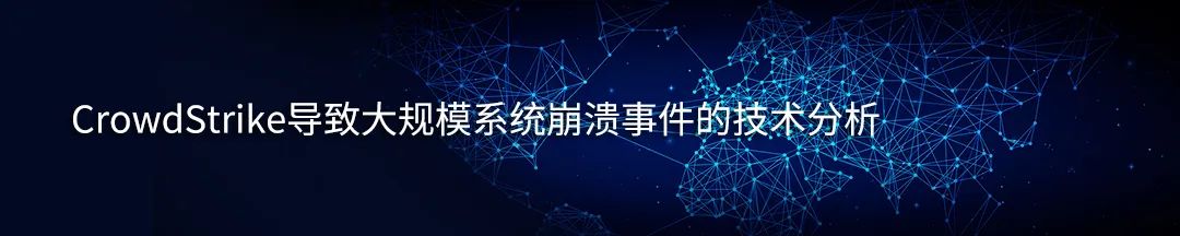说明:针对CrowdStrike导致大规模Windows主机蓝屏事件,安天云安全中心、安天CERT、安天攻防实验室三部门于07月21日发布了长篇分析报告《CrowdStrike 导致大规模系统崩溃事件的技术分析 ——暨对“猎鹰折羽”的沉思》(后文简称“猎鹰折羽”报告)。同时也推进了多点的分析验证工作,本报告披露其中部分内容。