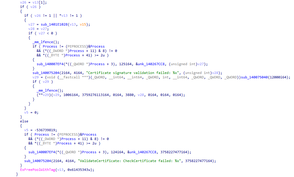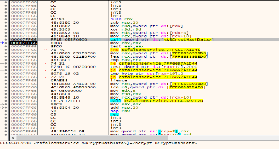 调用Windows自带加密基元库bcrypt.dll中BCryptFinishHash函数对文件内容进行hash验证,该函数定义于 bcrypt.h,验证通过后进行进一步解析操作。
