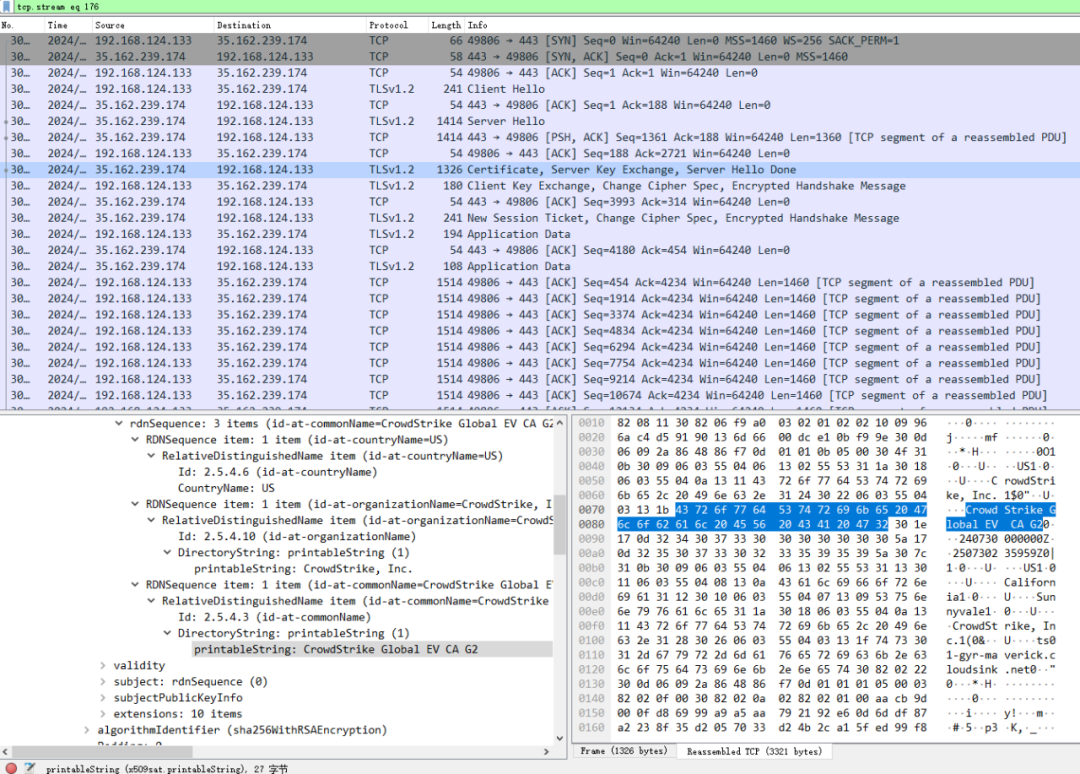 CrowdStrike Falcon Sensor 内置证书验证机制,独立于Windows证书管理机制,不信任Windows已授信证书。与其服务器通信时,使用其内部证书验证机制,验证服务器证书。