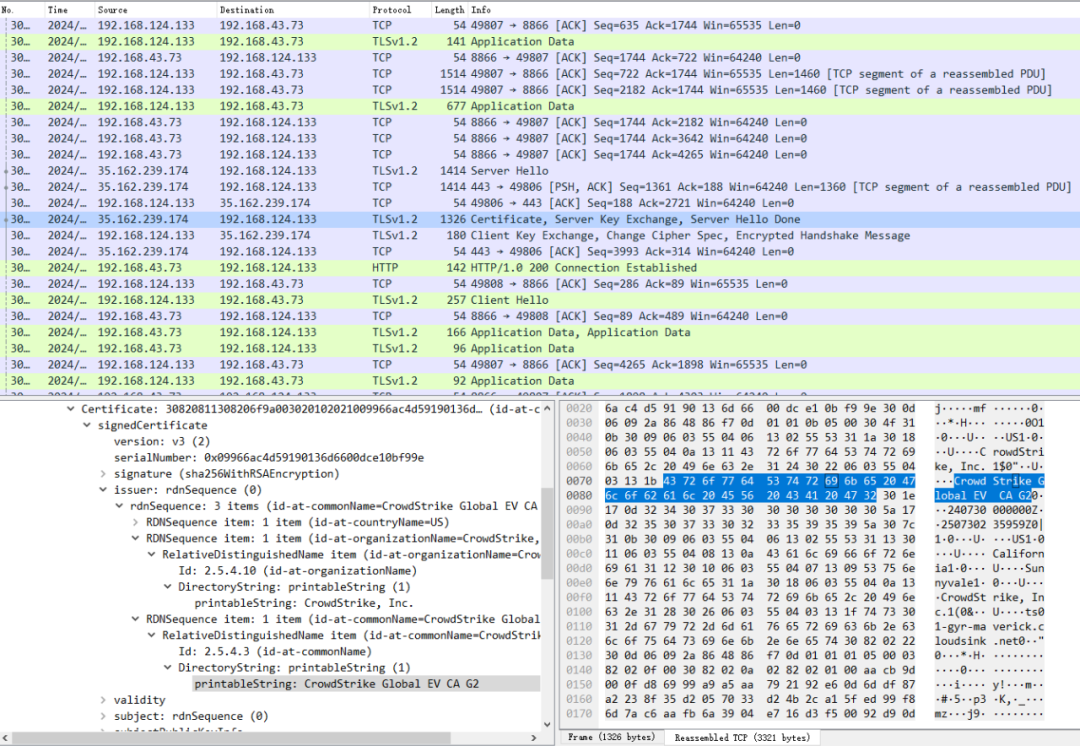 CrowdStrike Falcon Sensor 内置了网络通信通道筛选机制,在Windows 系统内配置全局代理的前提下,CrowdStrike Falcon Sensor 解析域名获取其服务器ip后,对系统代理做内部逻辑验证,不符合内部逻辑时直接绕过Windows全局代理,仍旧通过Windows网络直连其服务器获取策略和上传数据。(下图192.168.43.73为Windows全局代理)