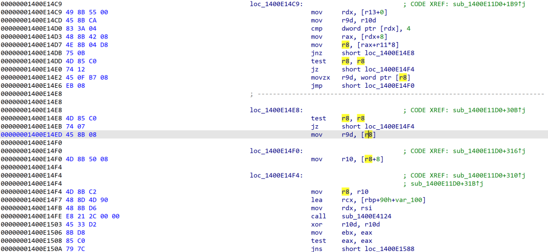 由上图可见,虽然程序在01400E14E8偏移处判断了r8寄存器是否为0(避免访问空指针),但其后并未进一步校验r8寄存器指向地址的合法性。随后程序在01400E14ED偏移访问了r8寄存器指向的非法地址,最终导致了蓝屏的发生。
