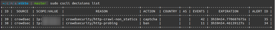 1. $ sudo cscli decisions list