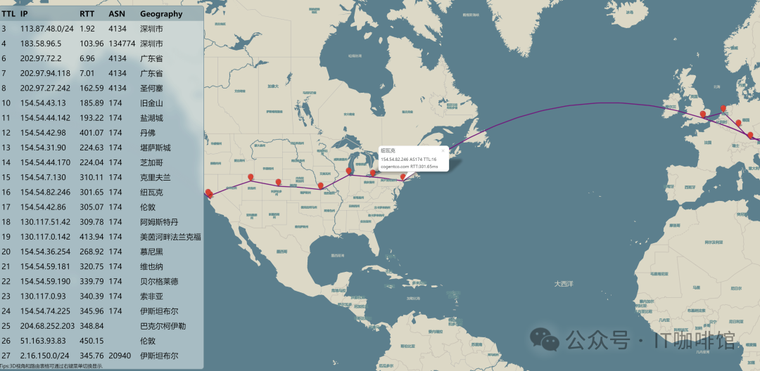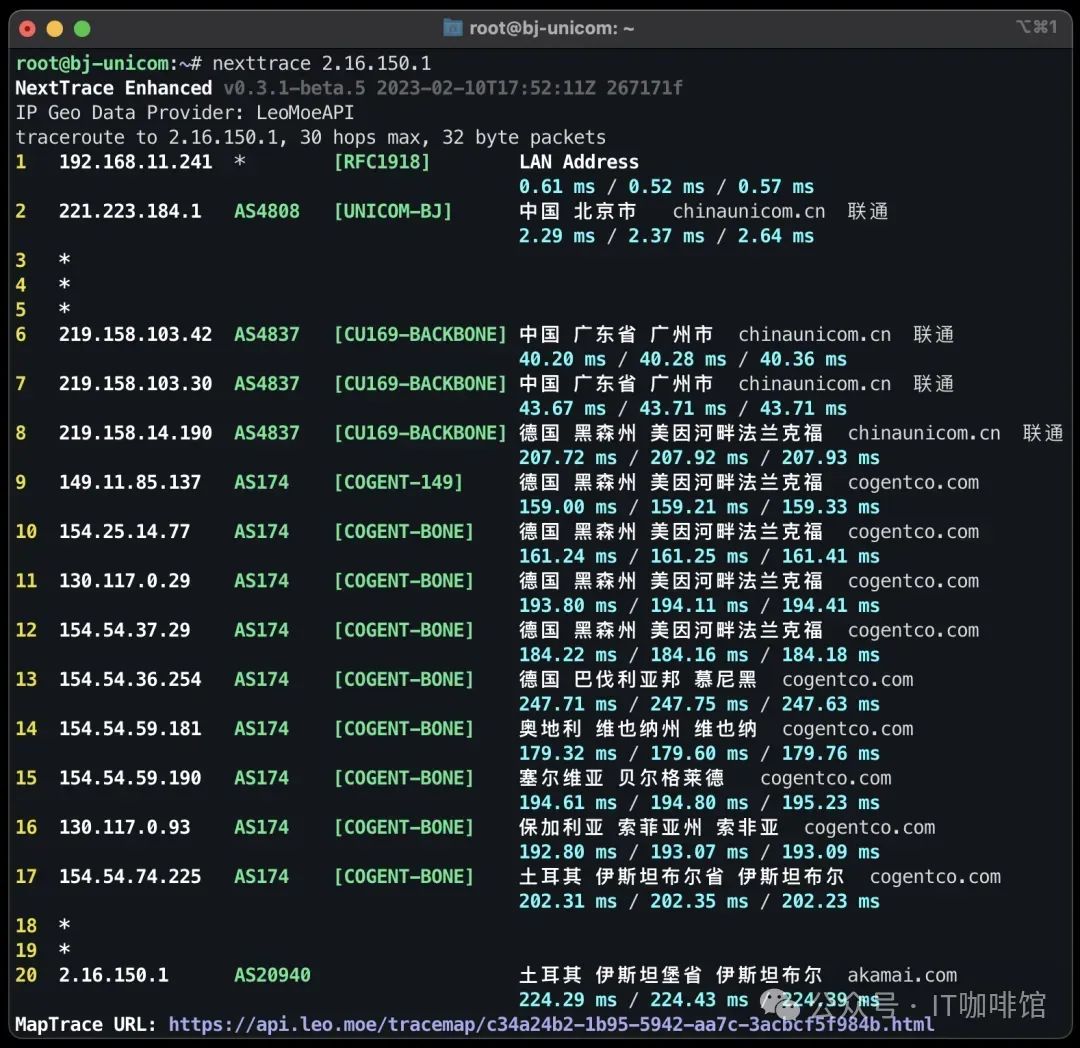 路由可视化:NextTrace 可以根据 traceroute 结果生成基于 webmap 的路由地图,帮助用户更直观地理解网络路径。