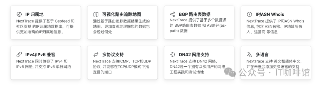 地理信息数据库:NextTrace 提供基于 Geofeed 和社区贡献的 GeoIP 数据库,有助于更直观地理解路由路径。