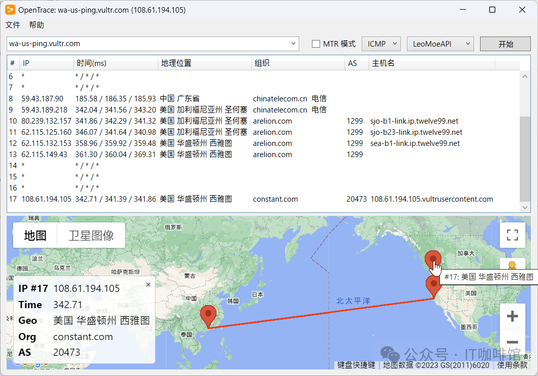 安装完成之后就可以使用nxtrace了,`NextTrace`使用`ICMP`协议默认执行 TraceRoute 请求,该协议同时`IPv4`支持`IPv6`