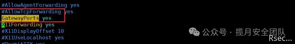 `要让它在连接到Internet的接口上侦听,我们必须在SSH服务器的配置中启用GatewayPorts选项。``[root@rsec ~]# vim /etc/ssh/sshd_config``GatewayPorts yes``或者``[root@rsec ~]# sed -i s/"#GatewayPorts no"/"GatewayPorts yes"/g /etc/ssh/sshd_config`