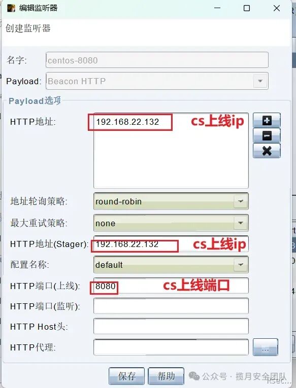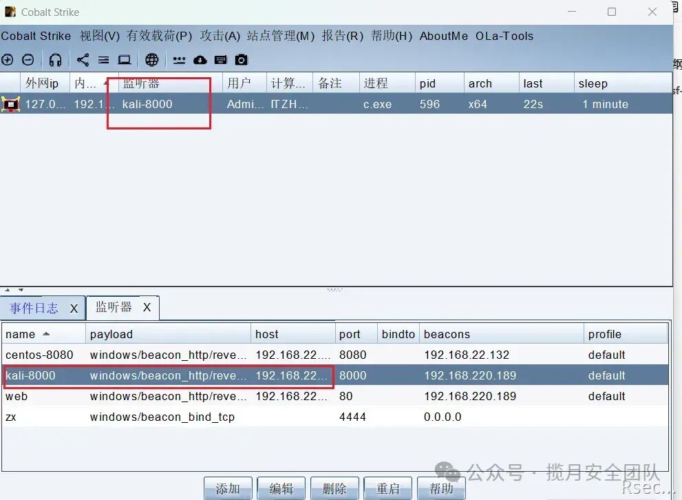 `# cs创建监2个监听器``kali-8000 192.168.220.189 8000 #用于上线``centos-8080 192.168.22.136 8080 #用于生成木马`