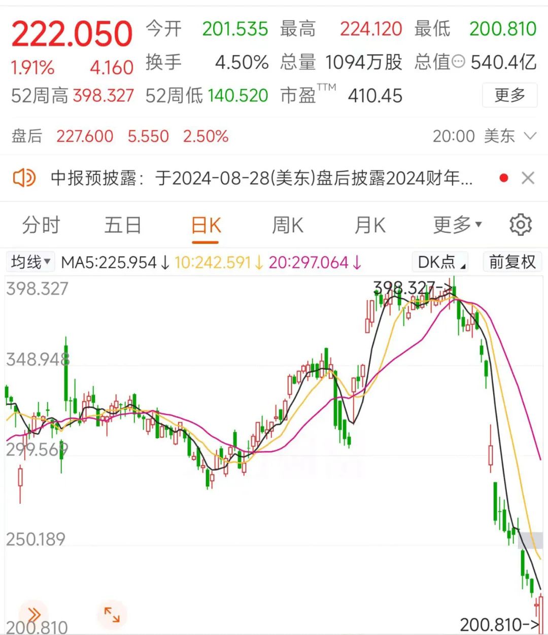 当地时间8月5日,CrowdStrike股价已跌至每股222.05美元