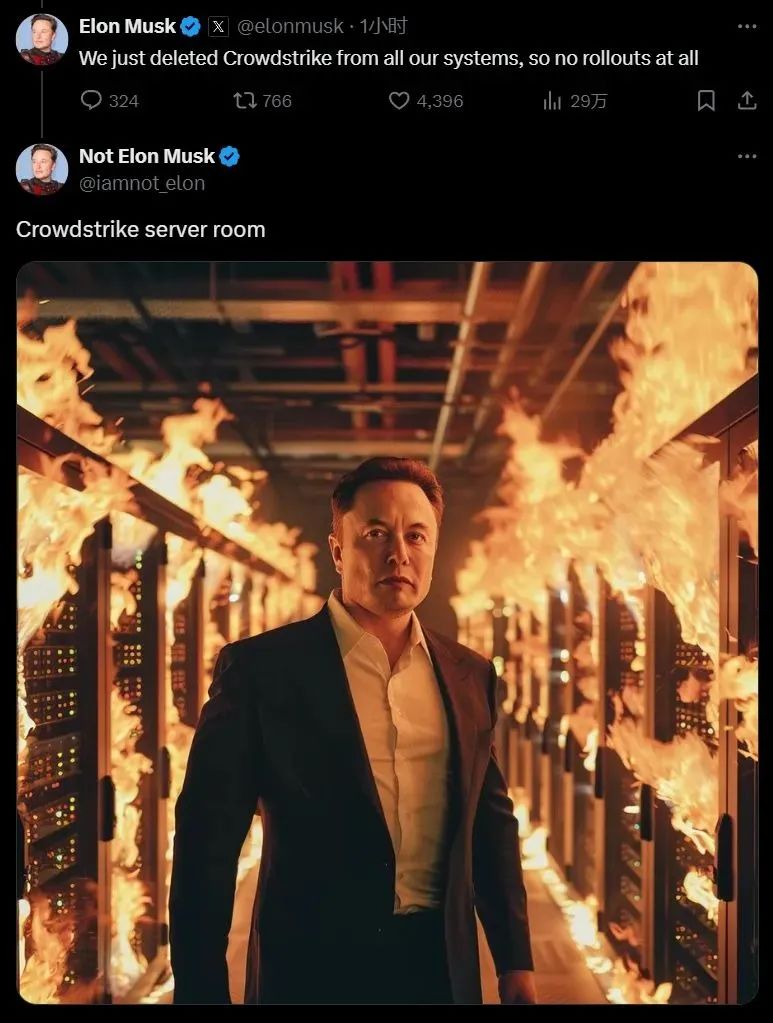 马斯克炮轰CrowdStrike并附上一张「火烧CrowdStrike机房」的AI生成图片
