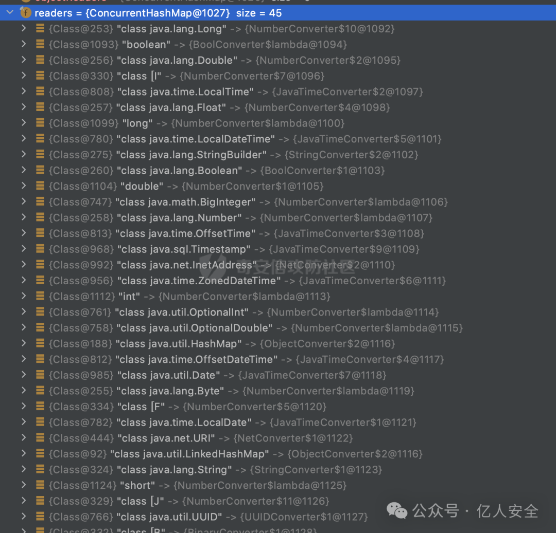 以HashMap的类型为例,对应的反序列化器为com.dslplatform.json.ObjectConverter,其主要支持以下数据类型: