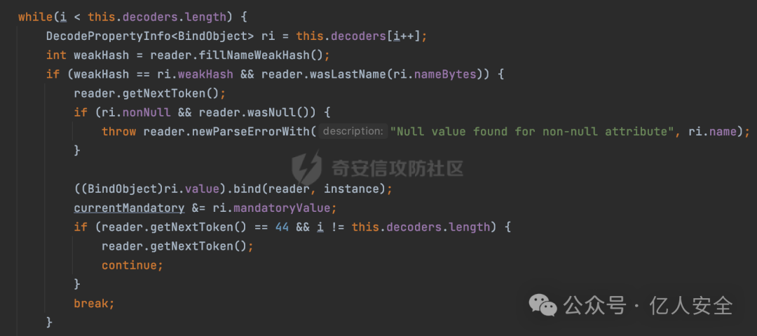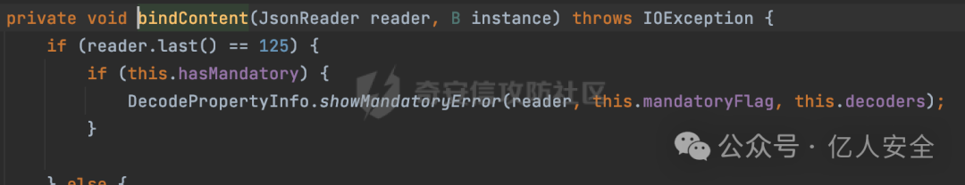 简单看看ObjectFormatDescription#bindContent的逻辑,看看WeakHash的具体含义。在ObjectFormatDescription#bindContent的逻辑中,首先检查当前的 JSON 标记是否为},如果是,则检查是否有必填属性未被赋值: