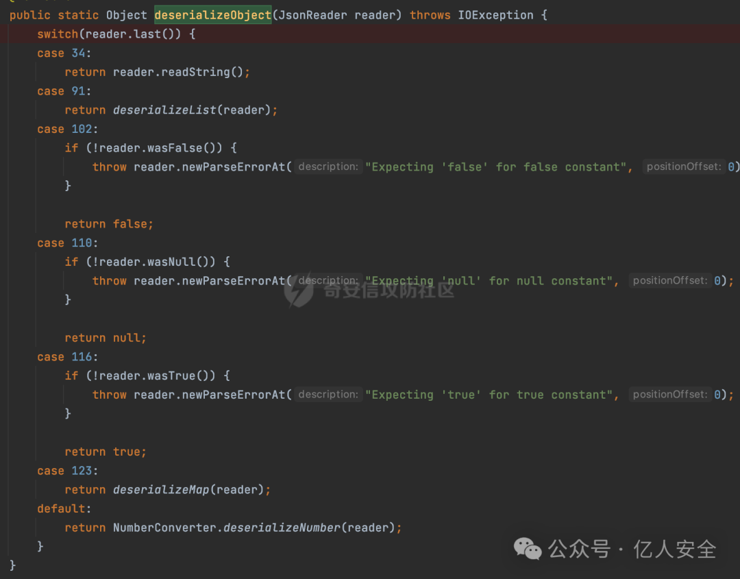 最后返回对应的length,获得当前的键属性。然后调用deserializeObject方法获取对应的值,这里会根据 JSON 值的类型,调用相应的反序列化逻辑,将 JSON 值转换为相应的 Java 对象,例如如果是"开头的话,会调用com.dslplatform.json.JsonReader#readString进行处理,如果均匹配不上,会调用NumberConverter.deserializeNumber当成数字进行处理,整个过程包含了一些错误处理逻辑,确保在遇到非法 JSON 数据时能够正确地抛出异常: