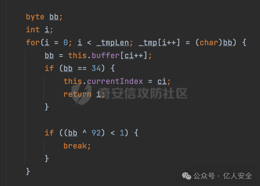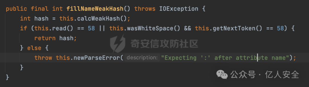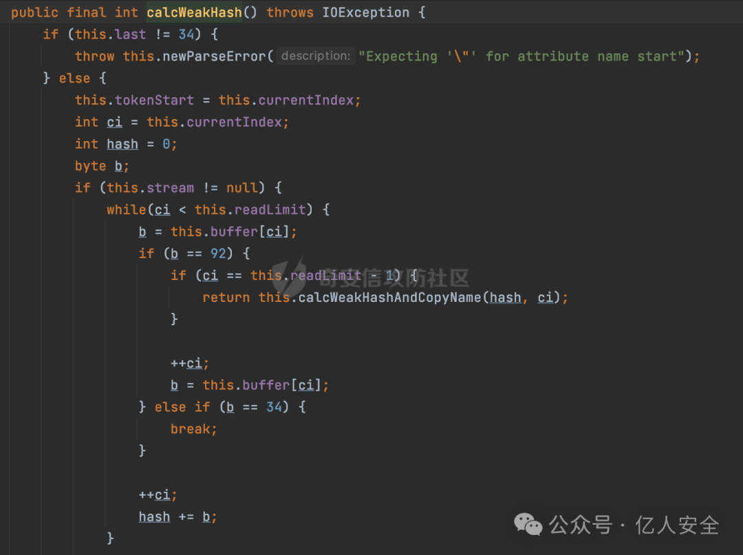 在calcWeakHash方法中,首先还是判断是否以"开头,然后进入一个循环,从 JSON 数据流中读取属性名称的字节,并将它们累加到 hash 中: