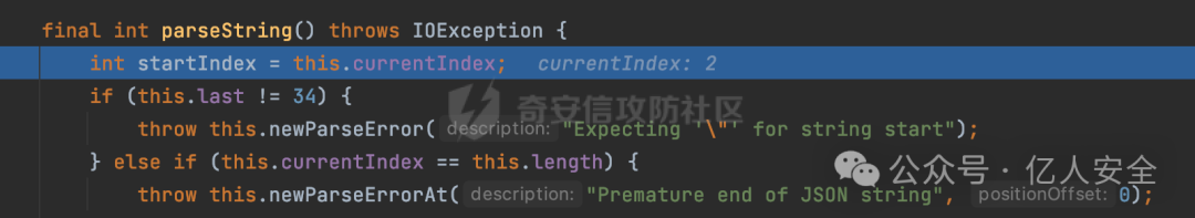 具体的解析逻辑主要在com.dslplatform.json.JsonReader#parseString进行处理,首先检查当前字符是否以"(表示字符串的开始)。如果不是,则抛出解析异常: