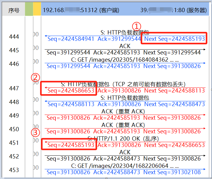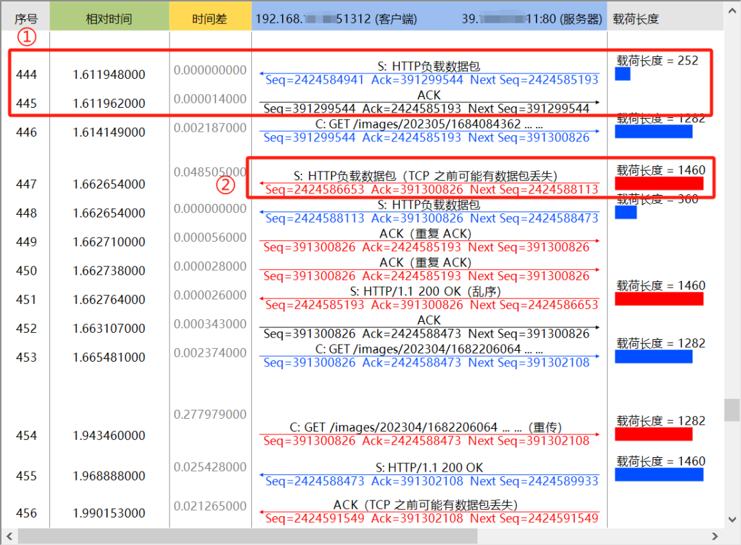 图4中②序号为447的报文箭头向左,表示该报文是由服务器向客户端发送,该报文的TCP 序列号Seq=2424586653,TCP确认序列号Ack=391300826,TCP载荷长度1460字节,经计算可得下一个报文的序列号即Next seq=2424588113,该报文标记为红色,起到“TCP异常流量标记”提示作用。括号中文字说明该异常标记为:“TCP之前可能有数据包丢失”(下面简称“可能丢包”),注意这个“可能”,并不意味着报文一定丢失了。