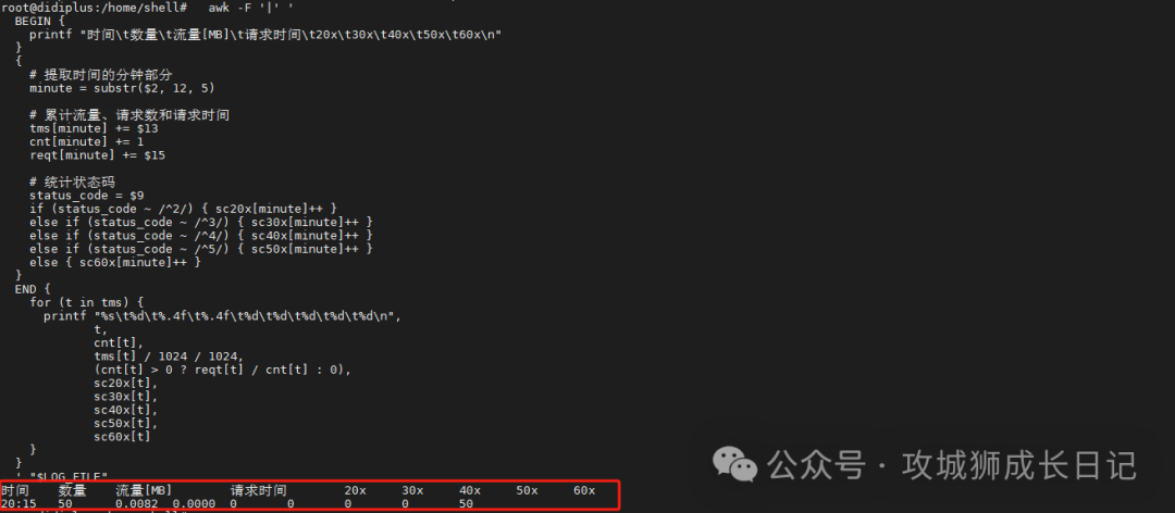 `awk -F '|' ' BEGIN { printf "时间\t数量\t流量[MB]\t请求时间\t20x\t30x\t40x\t50x\t60x\n" } { # 提取时间的分钟部分 minute = substr($2, 12, 5) # 累计流量、请求数和请求时间 tms[minute] += $13 cnt[minute] += 1 reqt[minute] += $15 # 统计状态码 status_code = $9 if (status_code ~ /^2/) { sc20x[minute]++ } else if (status_code ~ /^3/) { sc30x[minute]++ } else if (status_code ~ /^4/) { sc40x[minute]++ } else if (status_code ~ /^5/) { sc50x[minute]++ } else { sc60x[minute]++ } } END { for (t in tms) { printf "%s\t%d\t%.4f\t%.4f\t%d\t%d\t%d\t%d\t%d\n", t, cnt[t], tms[t] / 1024 / 1024, (cnt[t] > 0 ? reqt[t] / cnt[t] : 0), sc20x[t], sc30x[t], sc40x[t], sc50x[t], sc60x[t] } } ' "$LOG_FILE" `